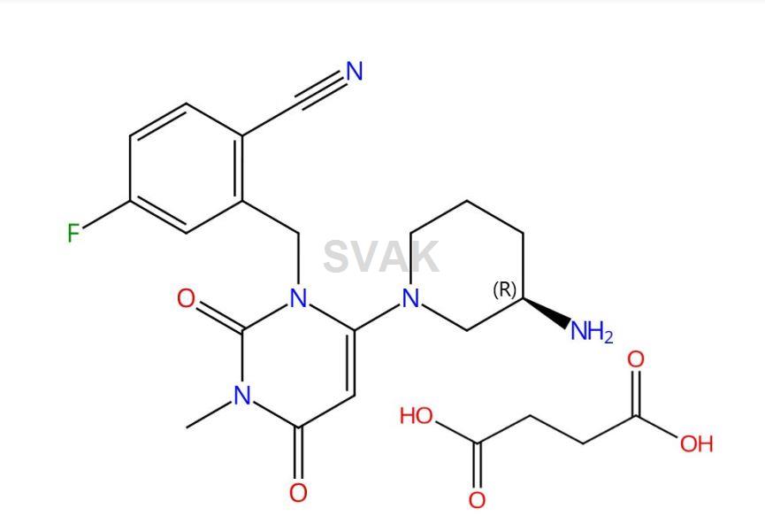 (R)-2-((6-(3-Aminopiperidin-1-yl)-3-methyl-2,4-dioxo-3,4-dihydropyrimidin-1(2H)-yl)methyl)-4-fluorobenzonitrile succinate ; Butanedioic acid, compd. with 2-[[6-[(3R)-3-amino-1-piperidinyl]-3,4-dihydro-3-methyl-2,4-dioxo-1(2H)-pyrimidinyl]methyl]-4-fluorobenzonitrile (1:1) (ACI) ; Trelagliptin Succinate ; SYR 111472 succinate ; SYR 472 |