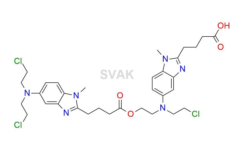 Bendamustine Trichloroethyl Dimer Impurity ; Bendamustine Dimer Impurity ; 4-[5-({2-[(4-{5-[bis(2-Chloroethyl)amino]-1-methyl-1H-benzimidazol-2-yl}butanoyl)oxy]ethyl}(2-chloroethyl)amino)-1-methyl-1H-benzimidazol-2-yl]butanoic Acid ; 4-[5-({2-[(4-{5-[Bis(2-chloroethyl)amino]-1-methyl-1H -benzimidazol-2-yl}butanoyl)oxy]ethyl}(2-chloroethyl)amino)-1-methyl-1H -benzimidazol-2-yl]butanoic acid ; 5-[bis(2-Chloroethyl)amino]-1-methyl-1H-benzimidazole-2-butanoic Acid 2-[[2-(3-Carboxypropyl)-1-methyl-1H-benzimidazol-5-yl](2-chloroethyl)amino]ethyl Ester ; Bendamustine Chloro Dimer Impurity ; Bendamustine Related Compound H (USP)
