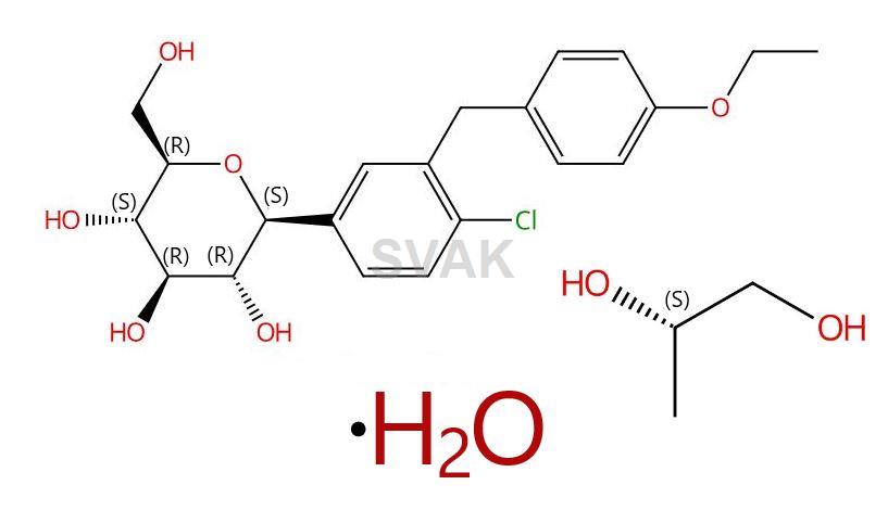 (2S,3R,4R,5S,6R)-2-(4-chloro-3-(4-ethoxybenzyl)phenyl)-6-(hydroxymethyl)tetrahydro-2H-pyran-3,4,5-triol compound with (S)-propane-1,2-diol (1:1) hydrate ; Dapagliflozin Propanediol Hydrate ; Dapagliflozin (S)-propylene glycol hydrate ; Dapagliflozin propanediol monohydrate ; Edistride ; Farxiga ; Forxiga ; (1S)-1,5-Anhydro-1-C-[4-chloro-3-[(4-ethoxyphenyl)methyl]phenyl]-D-glucitol (S)-propane-1,2-diol (1:1) monohydrate |